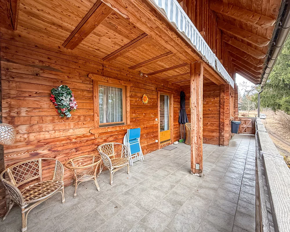 Der Zugang zum Haus erfolgt unter anderem über den Kellerbereich. Von dort gelangt man in das erste Obergeschoß, indem sich die Küche, das Wohnzimmer und WC befinden. Vom Wohnzimmer aus betritt man den überaus großzügigen überdachten Balkon, der einen herrlichen Blick auf die umliegende sanfte Berglandschaft und Wälder bietet.